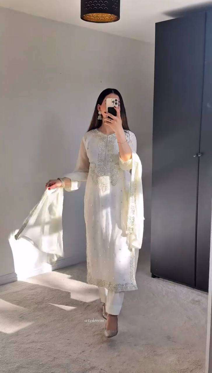 Women’s Georgette Embroidery Sequence Work with Rivet Moti Work Straight Kurti With Pant and Dupatta Set